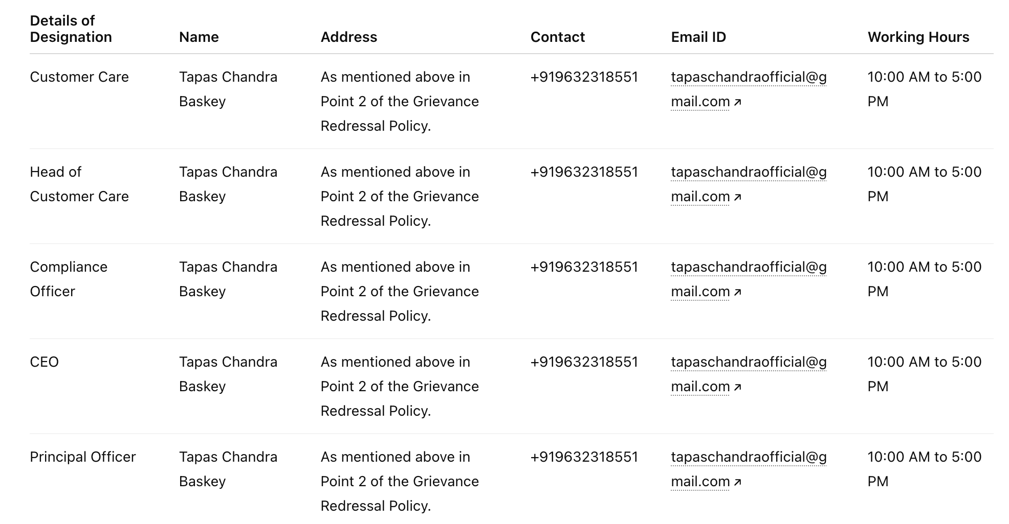 Compliance officer: Tapas Chandra Baskey. Telephone number: +91 9632318551. E-mail address: tapaschandraofficial@gmail.com.